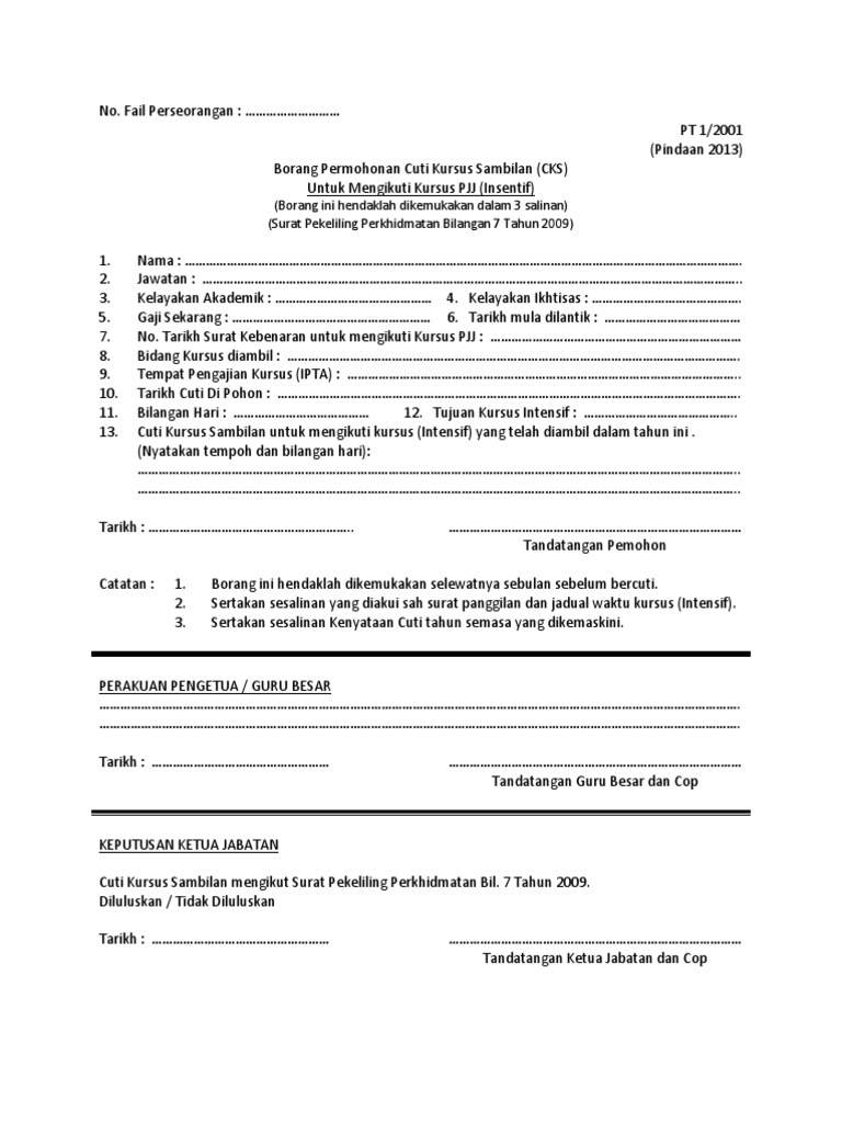 Borang permohonan cuti sakit disahkan sendiri (csds). Pegawai mestilah telah mendapat tawaran universiti semasa tanpa biasiswa. Baki cuti pemohon _____ hari. Borang smart card untuk kad matriks >> sini 3. (a) warganegara malaysia (b) keutamaan. Borang cuti tanpa rekod kursus intensif. Borang permohonan untuk menjalankan tugas sebagai penceramah sambilan.docx view download. Pt 1/2001 (pindaan 2013) borang permohonan cuti kursus sambilan (cks) untuk mengikuti kursus pjj (insentif) (borang ini hendaklah dikemukakan dalam 3 salinan) (surat pekeliling perkhidmatan bilangan 7 tahun 2009). Pt7/2001 (pindaan 2013) borang permohonan cuti kursus sambilan (cks) untuk mensikuti kursus pjj (lntensif) Cuti kursus sambilan (cks) untuk mengikuti (kuliah/tutorial/seminar/bengkel/kolokiu (kuliah/tutorial/seminar/bengkel/kolokium/latihan m/latihan amali/latihan industri) yang telah. Saya mengaku segala usaha telah saya buat untuk mengambil kesemua cuti disebabkan oleh kepentingan perkhidmatan, saya tidak dapat menghabiskan kesemua cuti rehat tersebut sebanyak _sebelum akhir tahun. Memahami peraturan cuti penjawab awam bahan pembelajaran secara e learning : Sambilan kursus asas dalam pengajian filem.