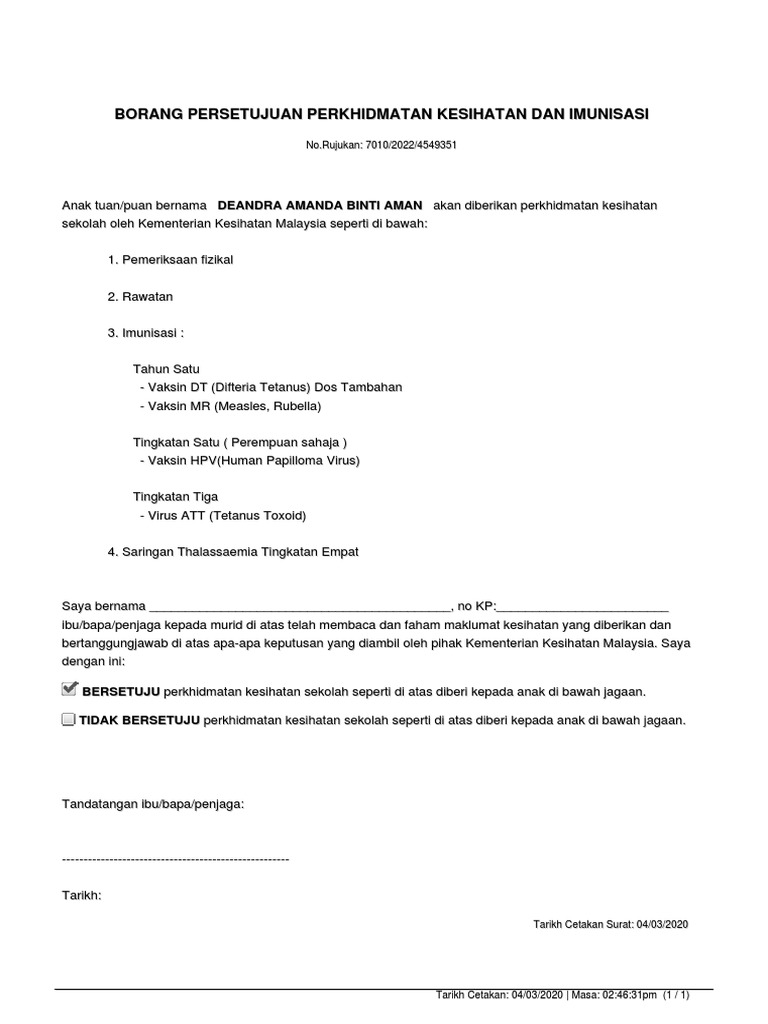 Borang Persetujuan Perkhidmatan Kesihatan Dan Imunisasi Tahun 1 - Untuk tujuan ini, kkm juga telah mendapatkan kerjasama kementerian pendidikan malaysia untuk membantu dalam.. Borang persetujuan perkhidmatan kesihatan dan imunisasi. Permohonan murid ke tahun 1 untuk tahun 2020 dan 2021 atul hamid. Melapor diri selepas menjalani ldp dalam /luar negeri. Trik internet gratis telkomsel 2 … Murid) persetujuan perkhidmatan kesihatan dan imunisasi saya ibu/bapa/penjaga kepada murid ini bersetuju / tidak bersetuju.